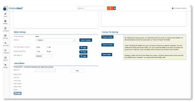 All events, reminders, and Outlook items update automatically to reflect the new matter.Switch an existing matter’s name or number—when both matters share the same owner and the destination matter has not yet been created in MatterAlert.