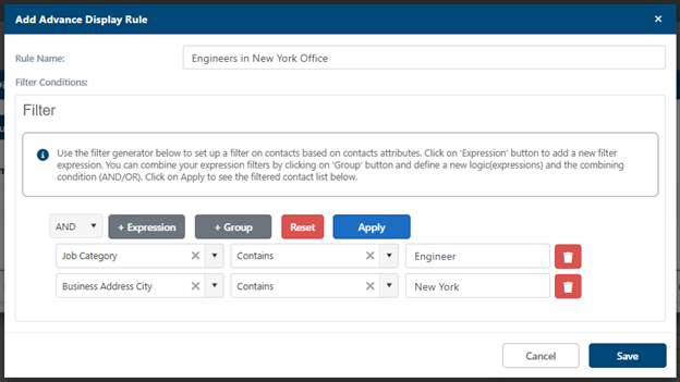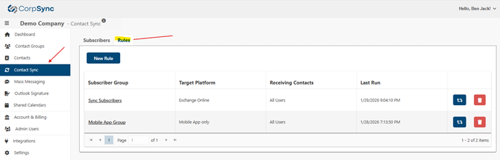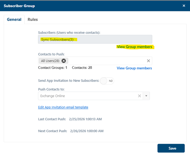 Subscription rules are now managed independently on a dedicated screen under Contact Sync > Rules Tab. This separation helps administrators distinguish between group settings and subscription logic, providing a clearer, more intuitive management experience. The underlying functionality remains unchanged, but the interface is more streamlined and accessible.