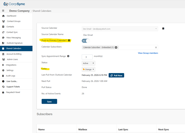 Calendar sync now offers robust new options, such as colour coding for improved visibility and organization. Administrators can choose to push events to the main calendar or create separate calendars for each subscriber, supporting flexible scheduling and clear separation of events.