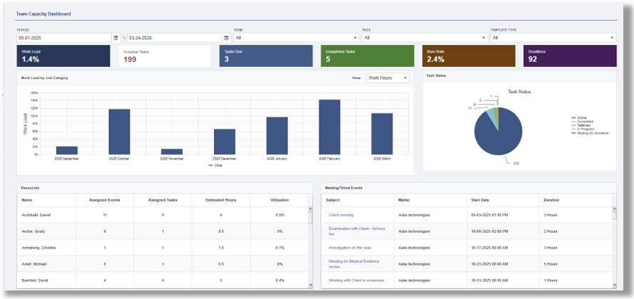 Interactive charts and real-time metrics surface critical indicators such as overdue work, upcoming deadlines, and overall team utilization.