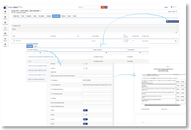 Generate documents directly from each matter, with the system auto-filling mapped fields.