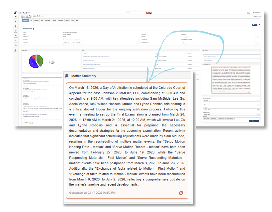 - Matter Summary using AI – Automatically generates a clear, executive-style summary of each matter, consolidating upcoming court dates, deadlines, pending tasks, and recent activity. The summary appears in a convenient panel on the Matter page and is available in English and French-Canadian. Users can refresh the summary at any time to get the latest insights.