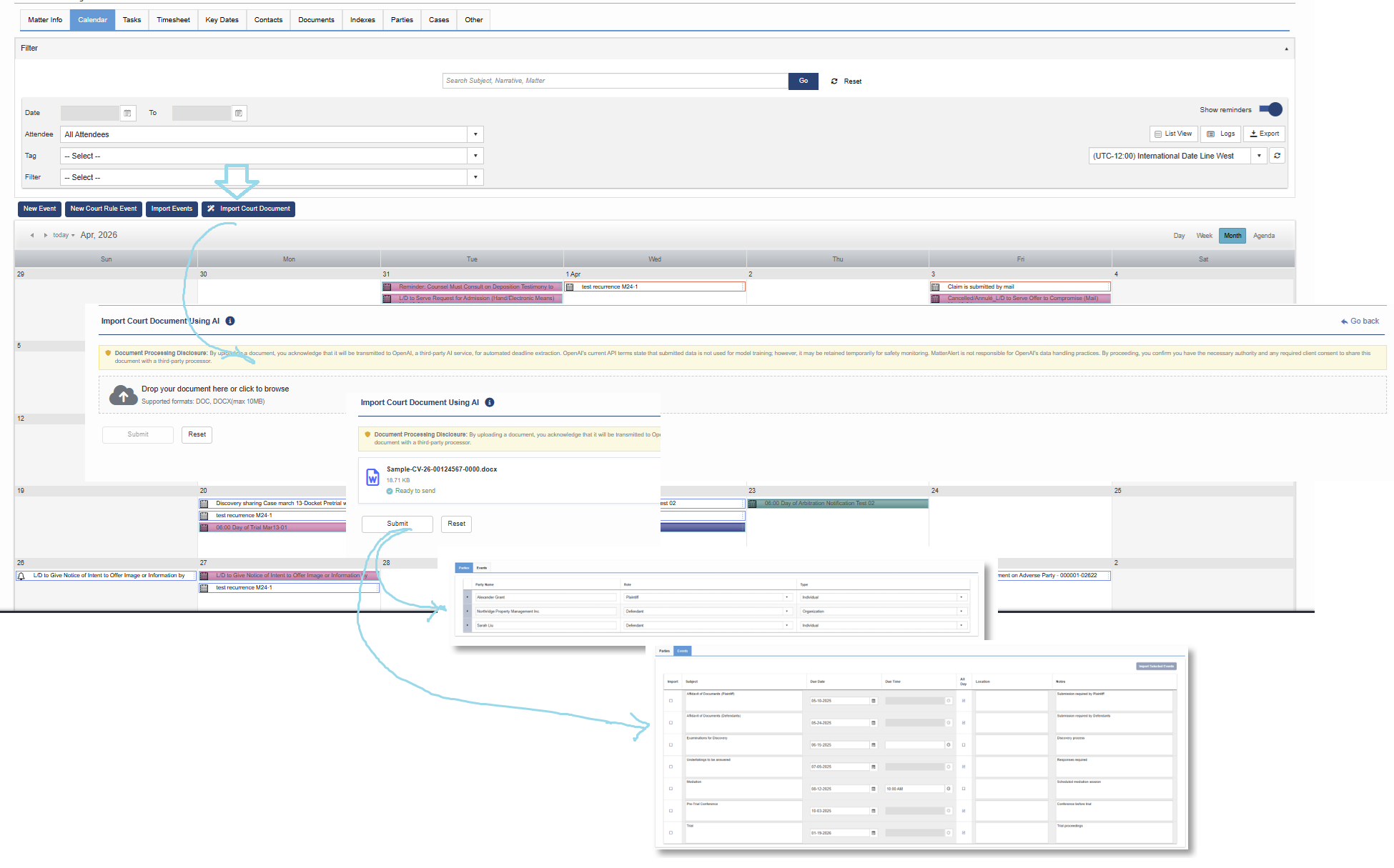 - Court Order Data Extraction using Open AI – Streamlines data entry by extracting parties, attorneys, contacts, and events from uploaded court documents (DOC/DOCX). The extracted information is displayed for review before import, ensuring accuracy while reducing manual effort. This feature works directly from the Matter Calendar, list views, or Cases page.