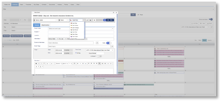 Users can assign familiar Outlook category colors directly within MatterAlert for events and matters, ensuring that color coding remains synchronized between MatterAlert and Outlook. This enhancement improves visibility, organization, and recognition of key items across calendars.
