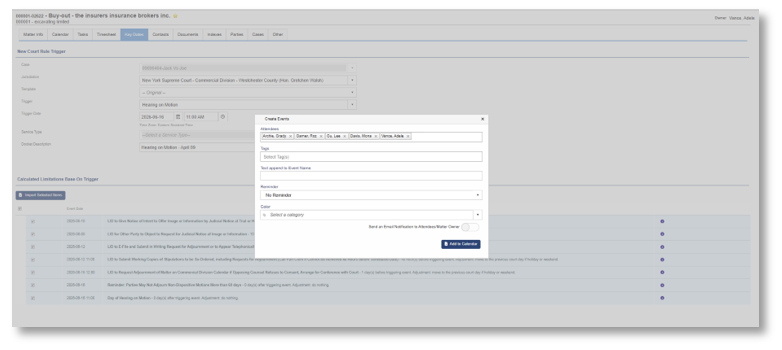 - Optional Notifications for Court Rule Events – When events are generated through court rule docketing, notifications can now be optionally triggered for matter owners and/or attendees based on central configuration. This prevents silent calendar entries and ensures key stakeholders are properly informed when events are created if needed per selection at the time of adding the .